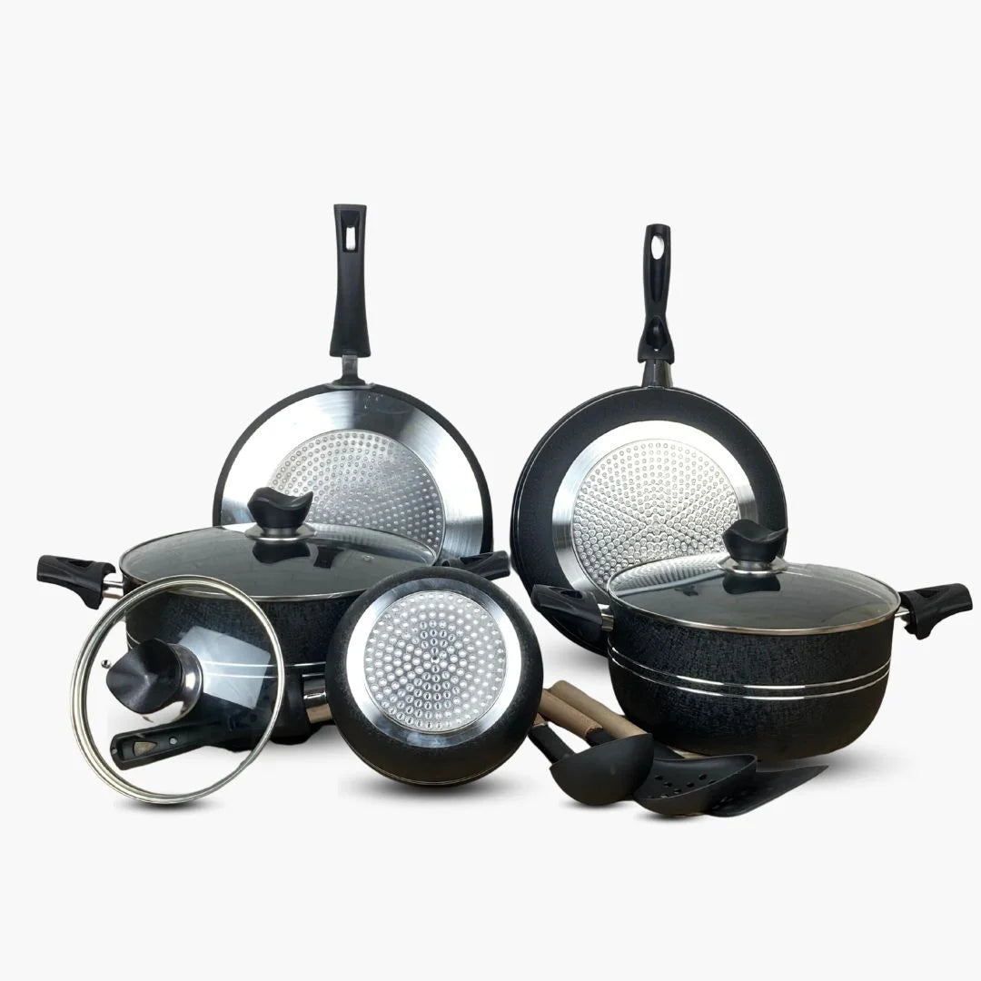 Upgrade your kitchen with the Oscar Induction base Non Stick Cookware Set—designed especially for Pakistani homes that value quality, convenience, and style. This 11-piece set includes everything you need for everyday cooking: nonstick cooking pots with glass lids, a saucepan, frypan, tawa/roti maker, and wooden spoons.